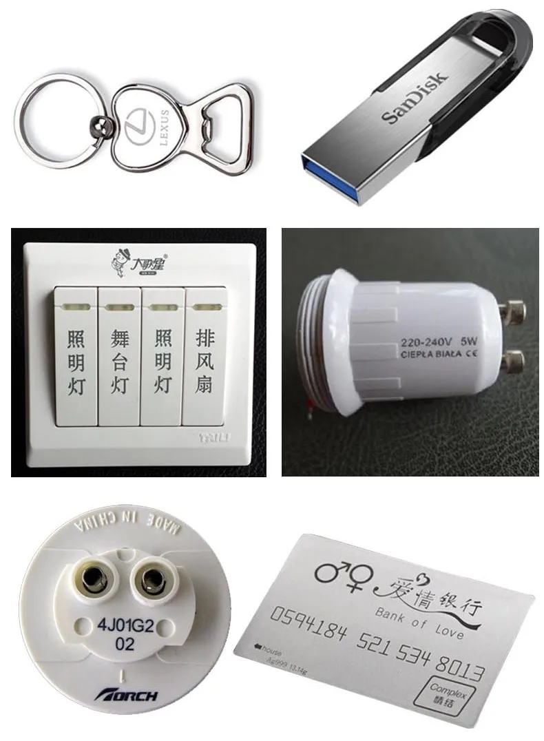 Mobile phone keypads, nonopaque-plastic keypads, electronic components, integrated circuits (IC), electrical appliances, communication products, sanitary wares, tool accessories, cutters, watches, glasses, jewelry, auto parts, boxes, bags, clasps, cookers, stainless steel products, etc